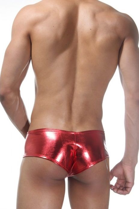 Мужские трусы-хипсы красного цвета, из гладкого, плотного и хорошо тянущегося материала. Зад полностью блестящий, трусы с низкой посадкой. Спереди две кружевные широкие вставки.