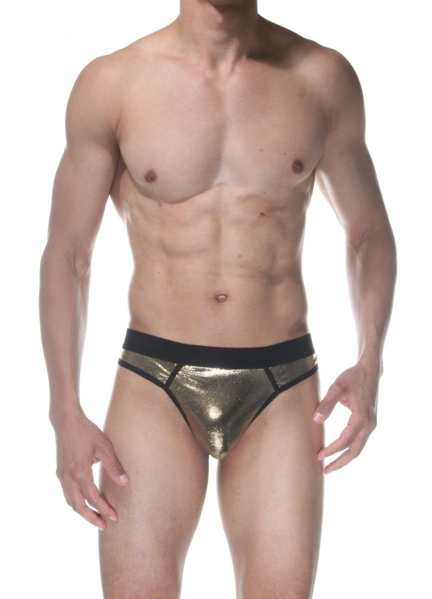 Золотистые блестящие мужские трусы-стринги.