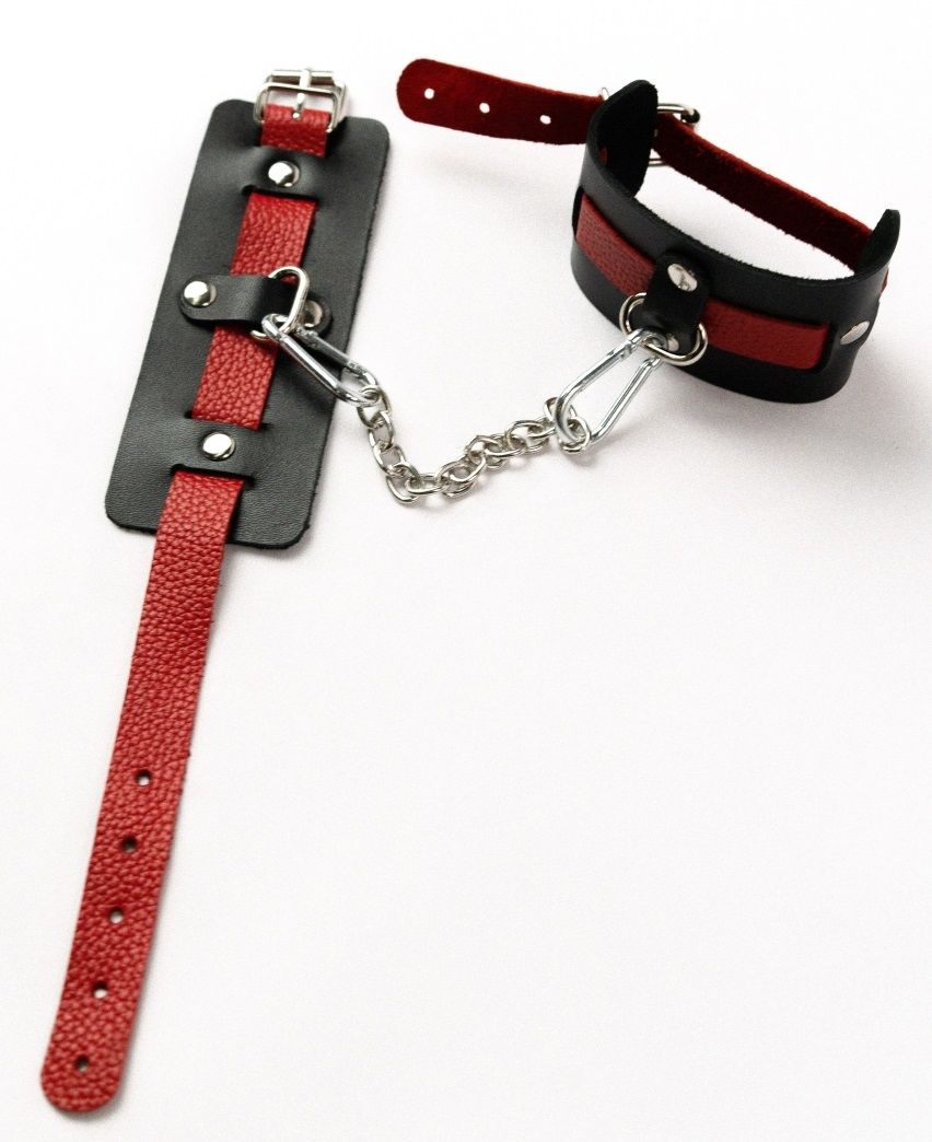 Кожаные оковы с контрастным декором и заклепками имеют кольца для крепления и металлическую сцепку.