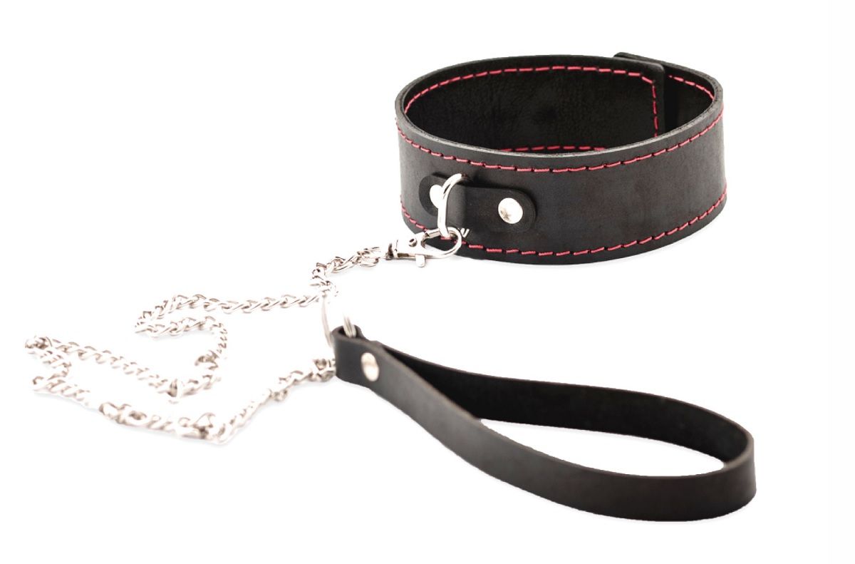 Широкий ошейник с контрастной строчкой и поводком. Выполнен из натуральной кожи. Поводок из металлической цепочки снабжен удобной ручкой. Ширина ошейника - 4 см. Длина ошейника - 38 см. Длина поводка - 80 см.