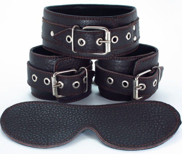 Набор БДСМ-аксессуаров из мягкой кожи черного цвета. В комплекте: маска на глаза, ошейник, манжеты-наручники.