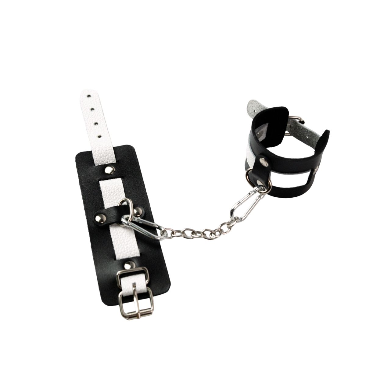 Оковы состоят из двух деталей: основа прямоугольной формы из натуральной кожи черного цвета и ремешок белого цвета с прочной хромированной фурнитурой в виде овального кольца. Расположение ремешка через прорези основной части является декоративным решением, а также служит для лучшей регулировки размера. В комплект входит соединительная цепочка с двумя карабинами. Общая длина - 32 см. Длина манжеты - 15,5 см. Ширина манжеты - 6 см. Обхват - 20-29 см.