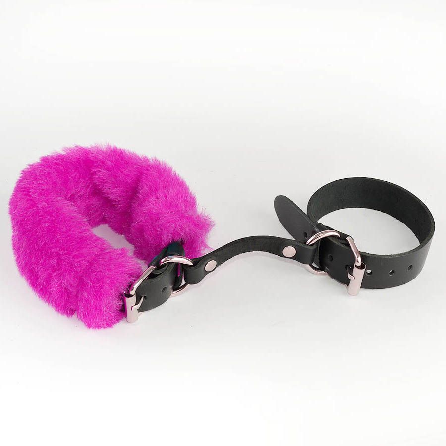Ремешки наручников изготовлены из натуральной кожи и декорированы съемным искусственным мехом яркого розового оттенка.